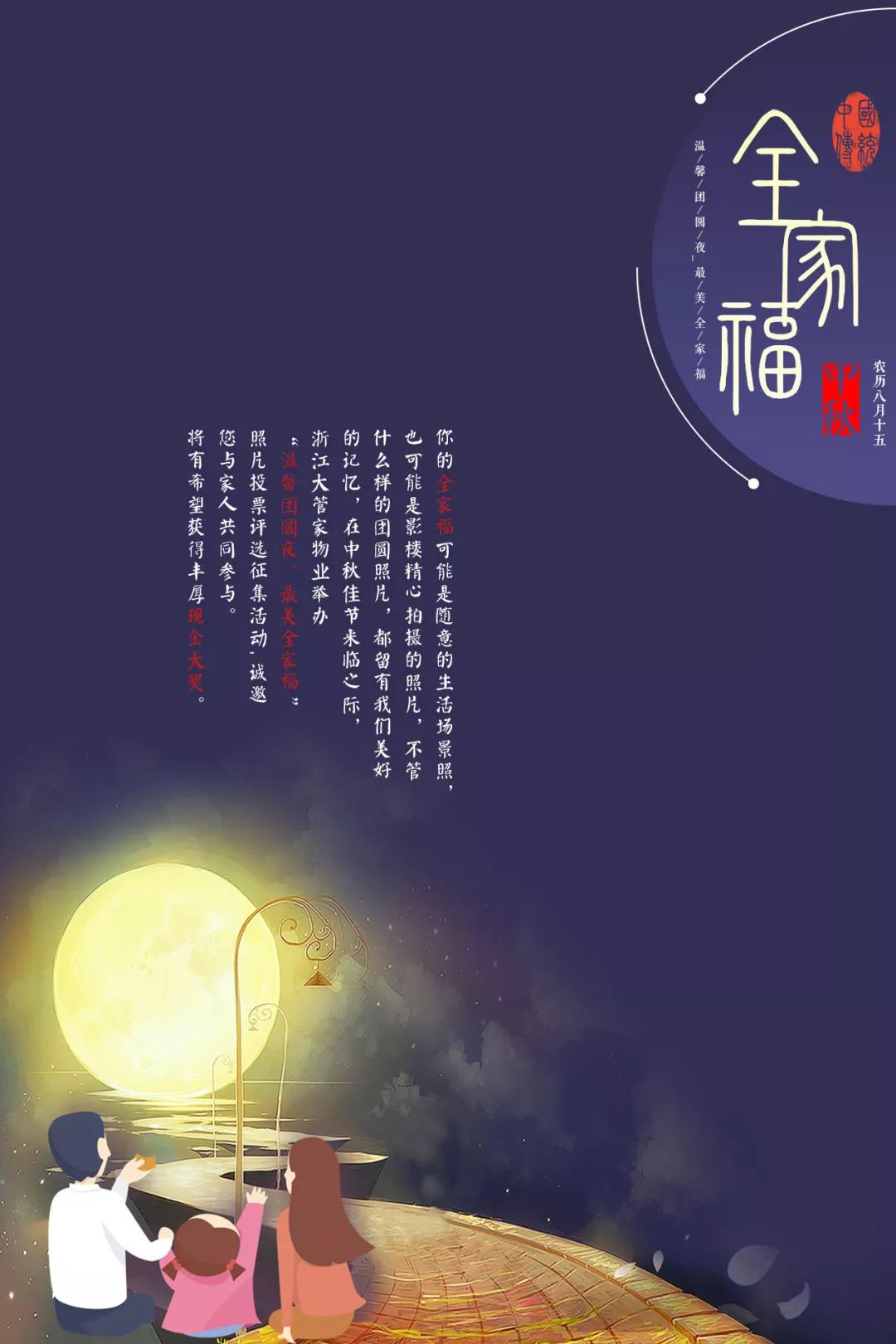 在中秋佳节来临之际,浙江大管家物业举办“温馨团圆夜、最美全家福”照片投票评选征集活动。在这个月满金秋、阖家团圆的节日气氛里,让广大员工与业主借此活动留下一个与家人共处的温馨记忆。