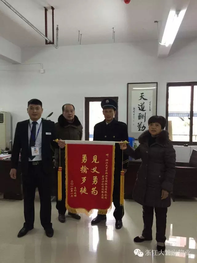 日前,悦林庄园的业主李女士到浙江大管家物业管理服务有限公司乐清分公司悦林庄园物业服务中心送上“见义勇为 勇擒歹徒”的锦旗。