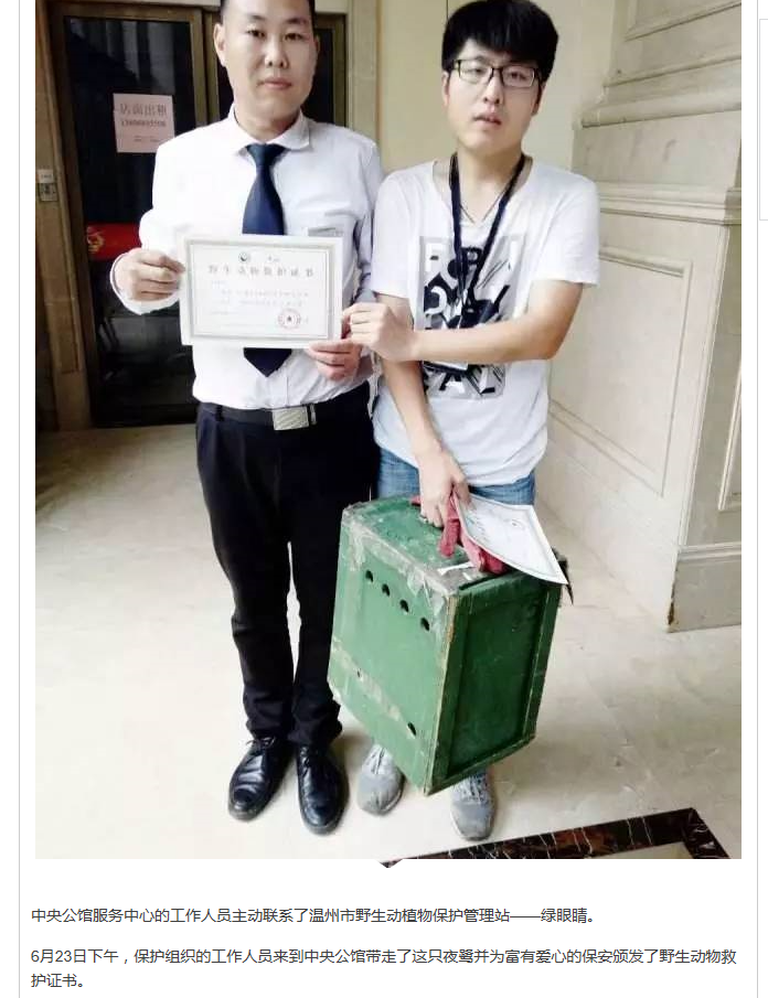 中央公馆服务中心来了一位不速之客,原来是国家二级保护动物