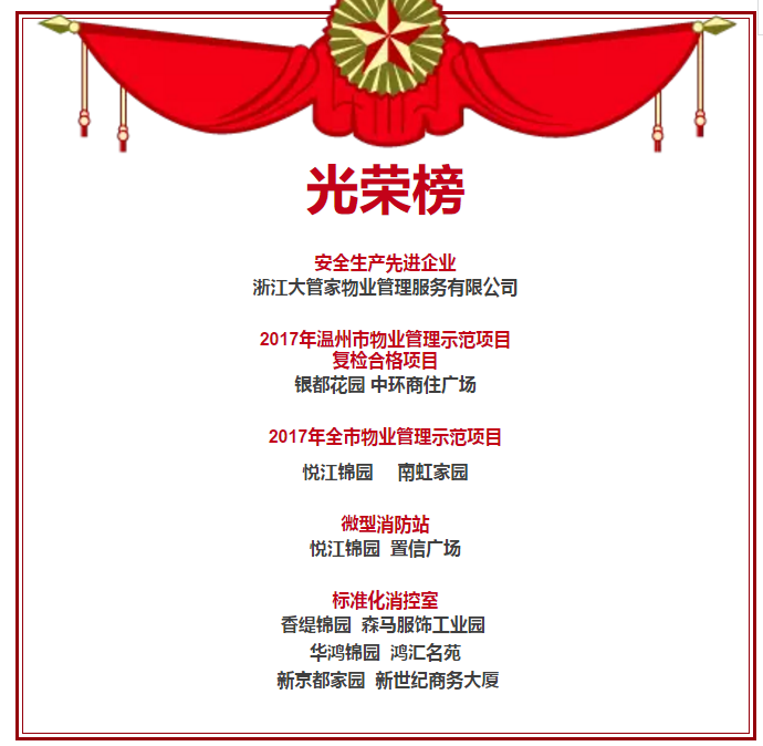 同时,为了推进物业管理行为规范,促进物业服务质量提升,会上还对2017年度各项优秀单位进行了表彰,浙江大管家物业在管的十余个项目名列其中。