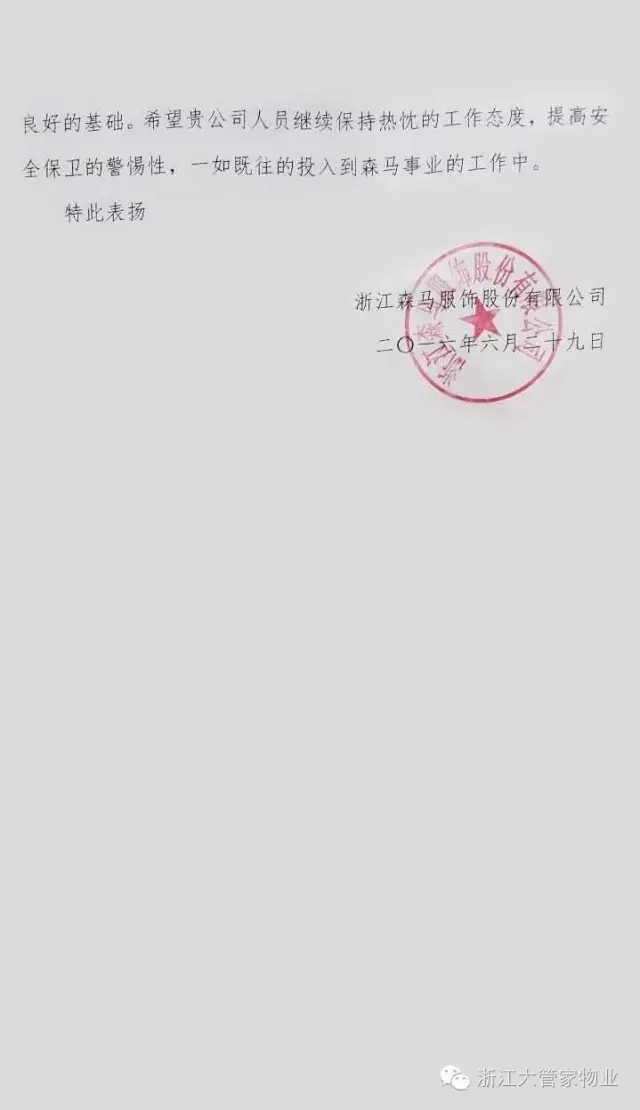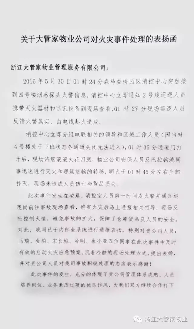 近日,大管家物业收到一封表扬函,原来是森马服饰娄桥工业园区发给公司的关于“大管家物业公司对火灾事件处理的表扬函”。